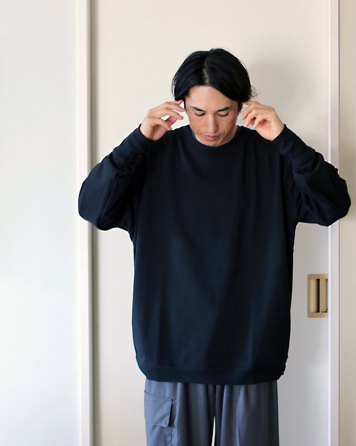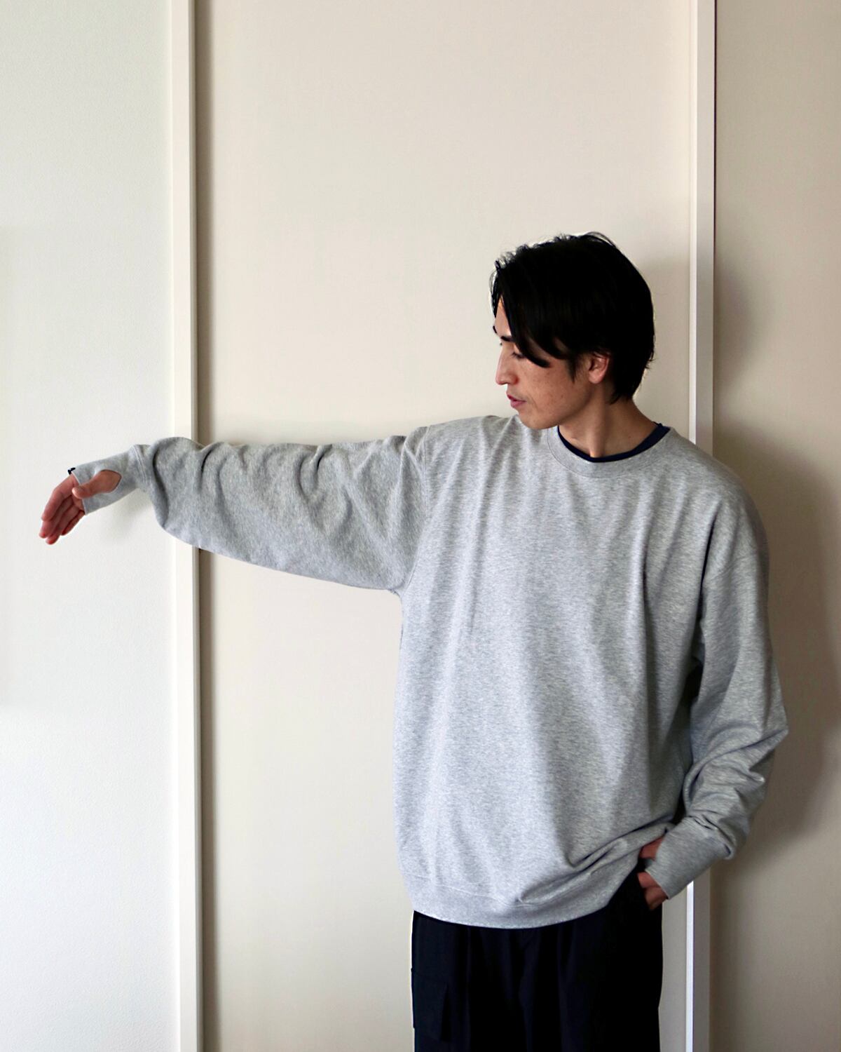生地感で言うと、スウェットとTシャツの丁度中間くらいの厚さになります。素肌で1枚でも、シャツとのレイヤリングにもどちらでも楽しめる様に設計しました。